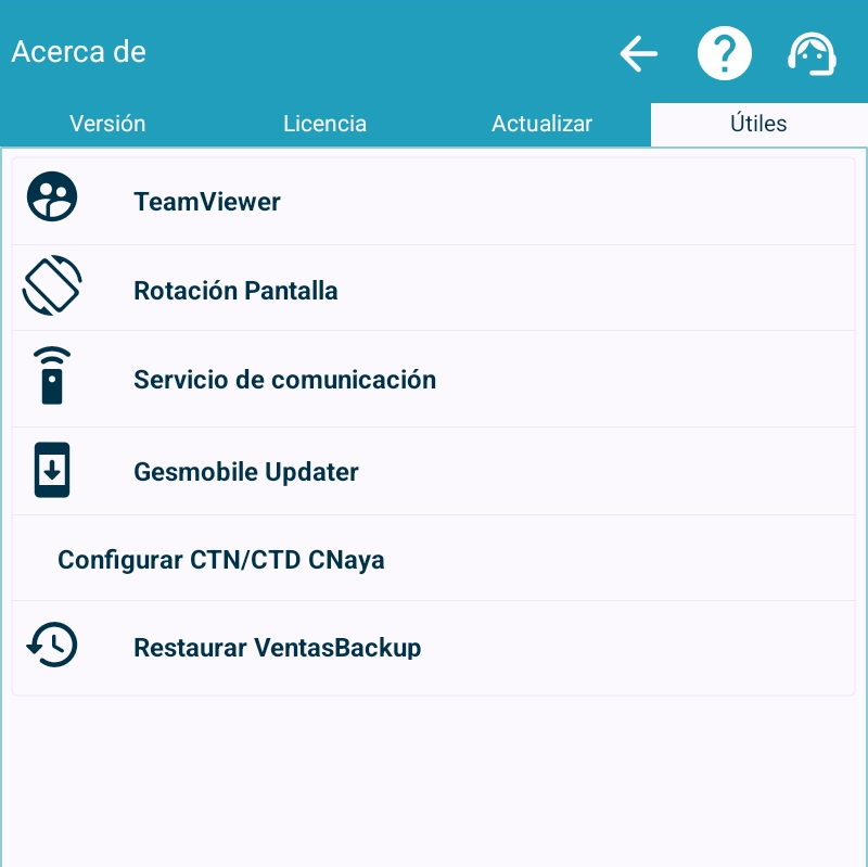 Útiles como TeamViewer, Rotación de Pantalla, Servicio de comuinicación, Gesmobile Updater, Configurar CTN/CTD para CNaya y Restarurar VentasBackup