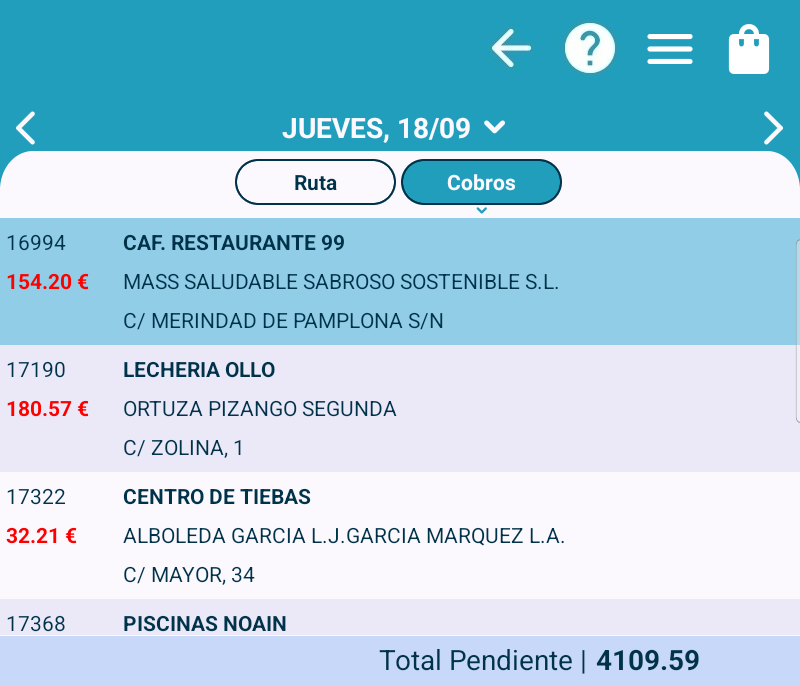 Total Pendiente: Valor total pendiente de cobrar entre todos los clientes de la ruta de ese día
