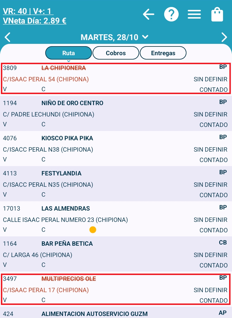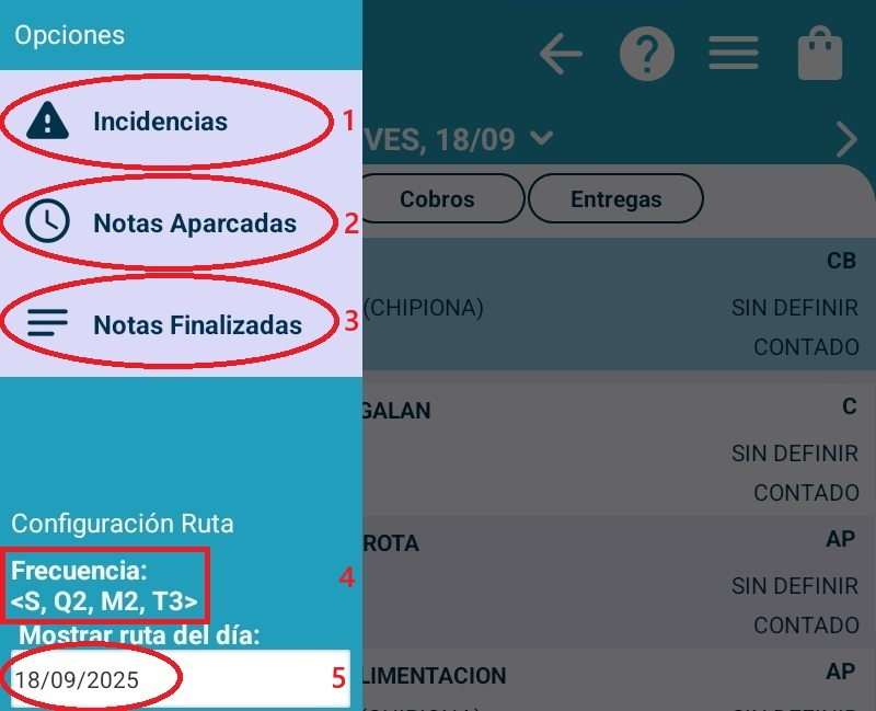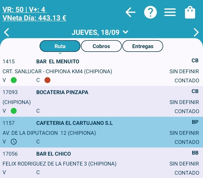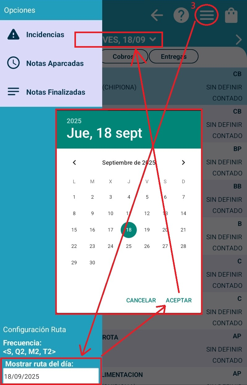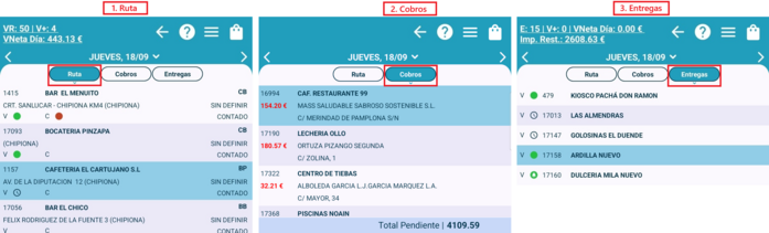 Se cargará la información de ese día, en las 3 pestañas de funcionalidades (Rutas, Cobros y Entregas).