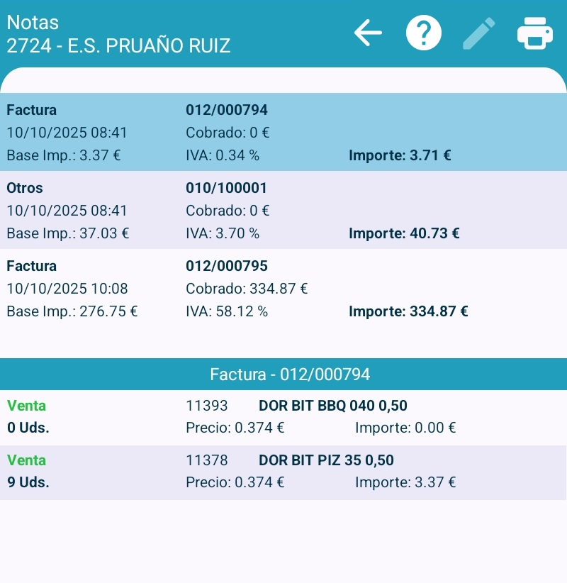 Por cada Nota seleccionada, se muestran sus Líneas de Venta(indiccandose también el tipo de Línea: Venta, Devolucion, etc)