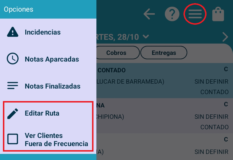Desde Rutas, se puede Editar la Ruta y Ver Clientes fuera de Frecuencia