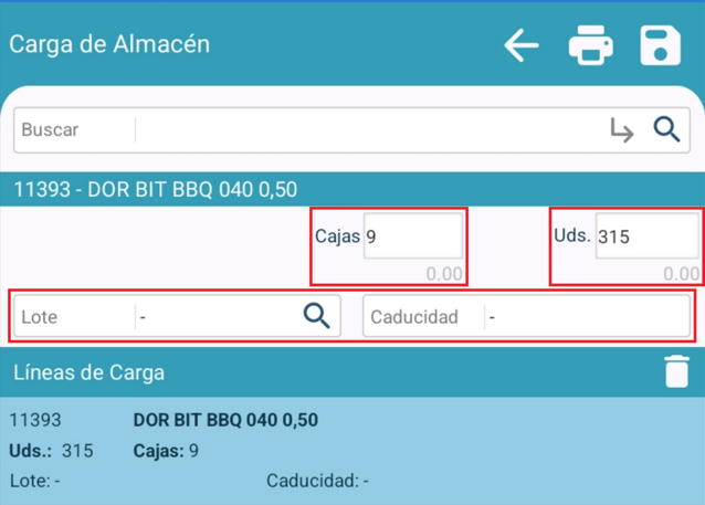 Tras especificar el Código de un Lote válido, las casillas de Cajas y Unidades variarán su Estado de Visibilidad. Cada una de estas Casillas tendrá una cifra numérica debajo, en color gris oscuro, que representa el Stock detectado