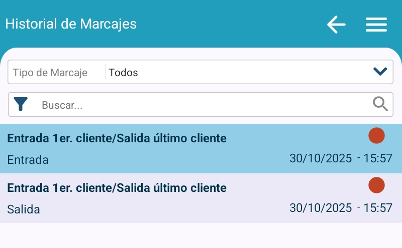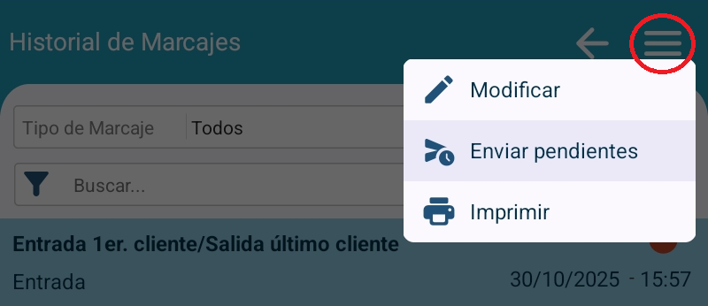 Se enviarán los Marcajes que no han sido comunicados todavia, indicados en el Historial con un circulo rojo