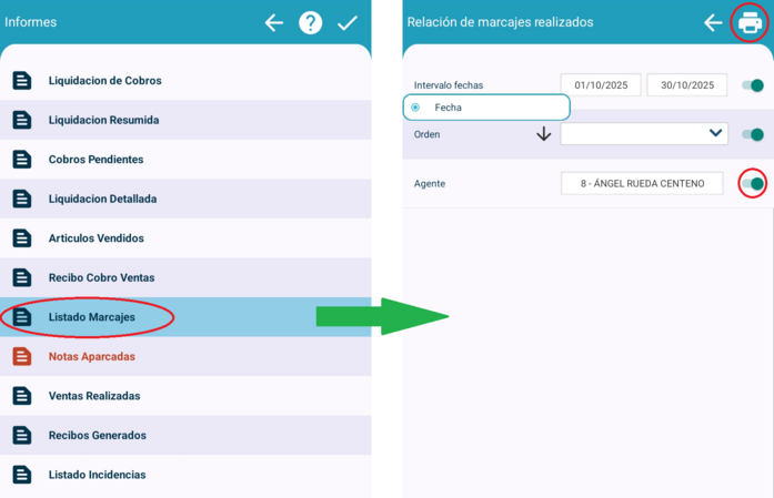 Se pueden revisar los Marcajes desde Ventas->Informes->Listado Marcajes -