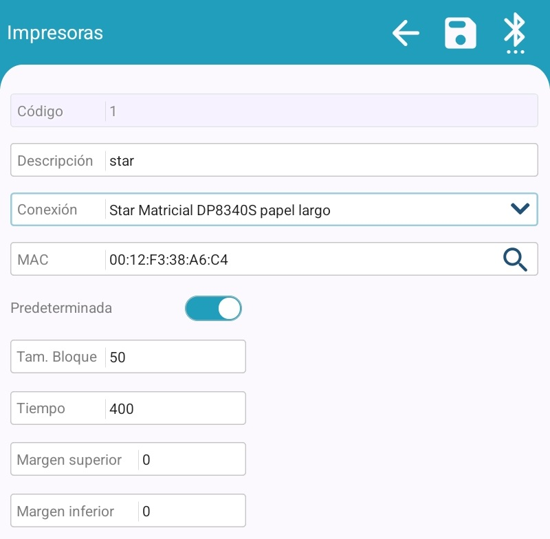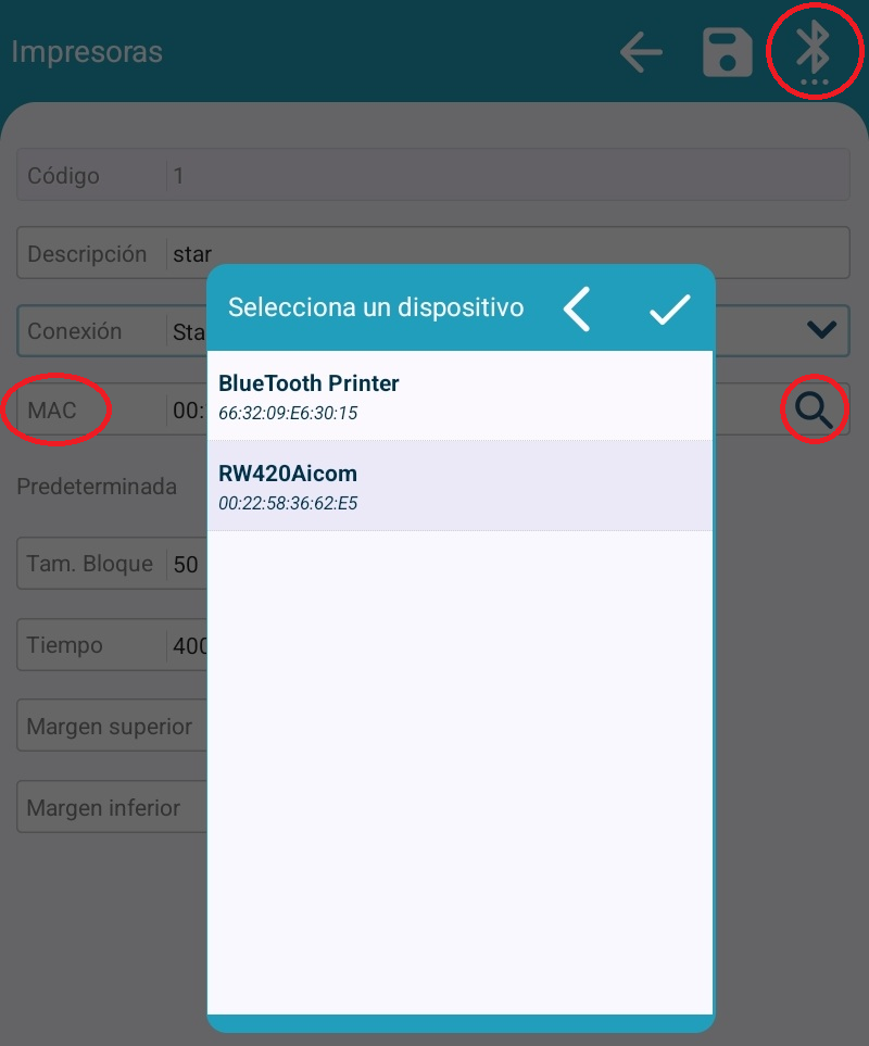 Al presionar sobre la imagen de búsqueda (lupa), se abrirá una ventana donde se listarán los dispositivos Bluetooth encontrados. Seleccionaremos nuestra Impresora y se asignará la MAC automáticamente