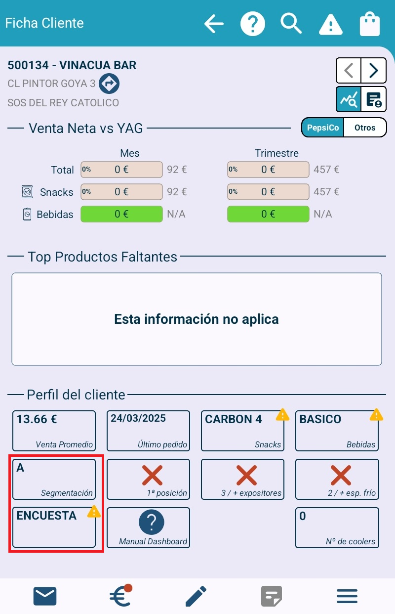 En caso de ser la encuesta obligatoria (se abrirá automáticamente al Visitar al Cliente para la Venta), aparecerá el indicador de Warning al lado de la Encuesta