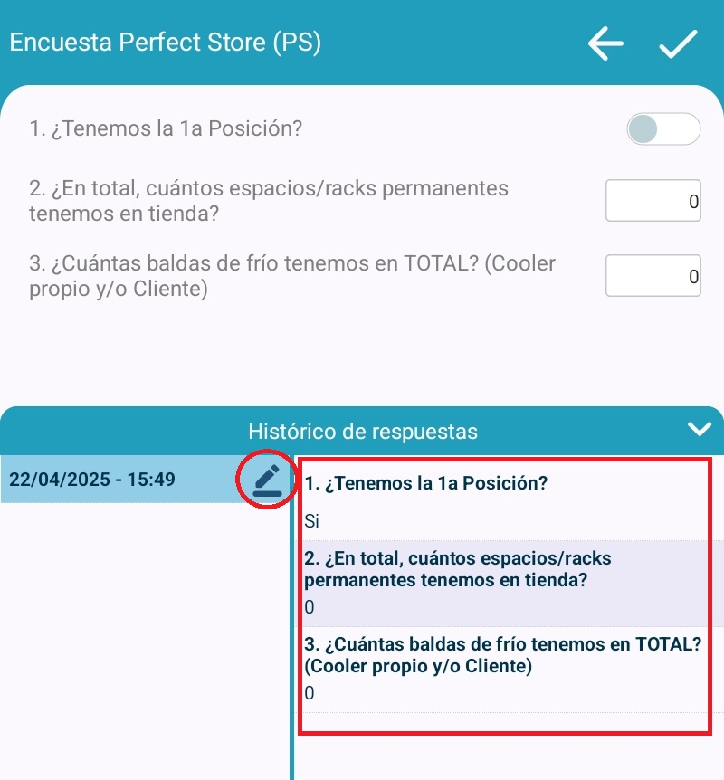 La encuesta consiste en una serie de preguntaas, y debajo se puede consultar el histórico de respuestas por si se quieren calcar los valores