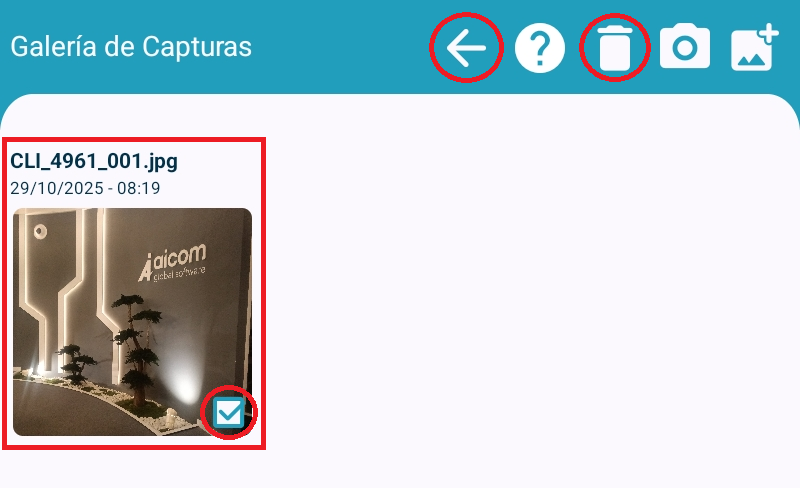 Manteniendo presionada la imágen, se activa el seleccionador, para borrar o para cancelar la selecciónPara deseleccionar las imágenes, se debe aprear el botón de Atrás