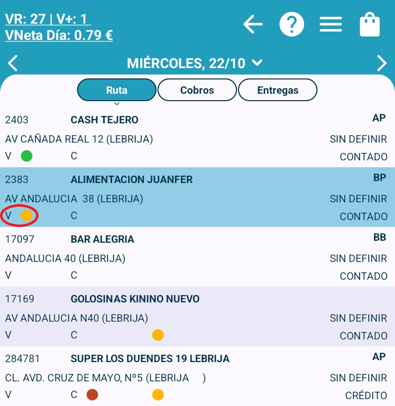 En la Ruta se mostrará en el Cliente que no tenga una Nota Finalizada con un círculo naranja
