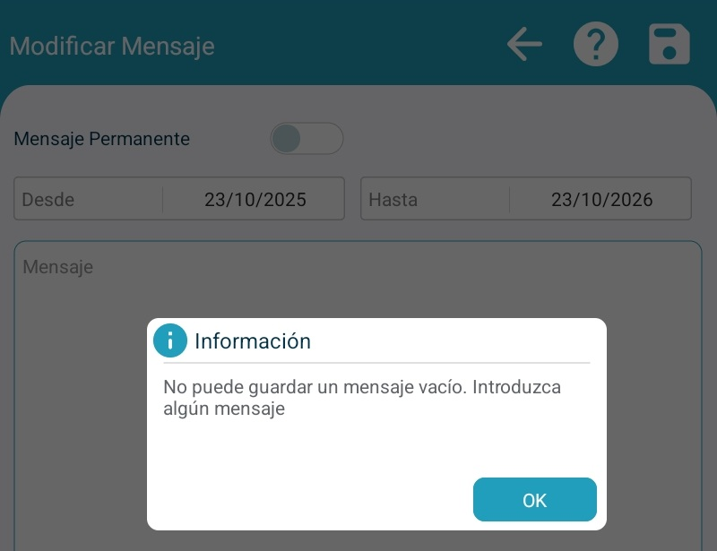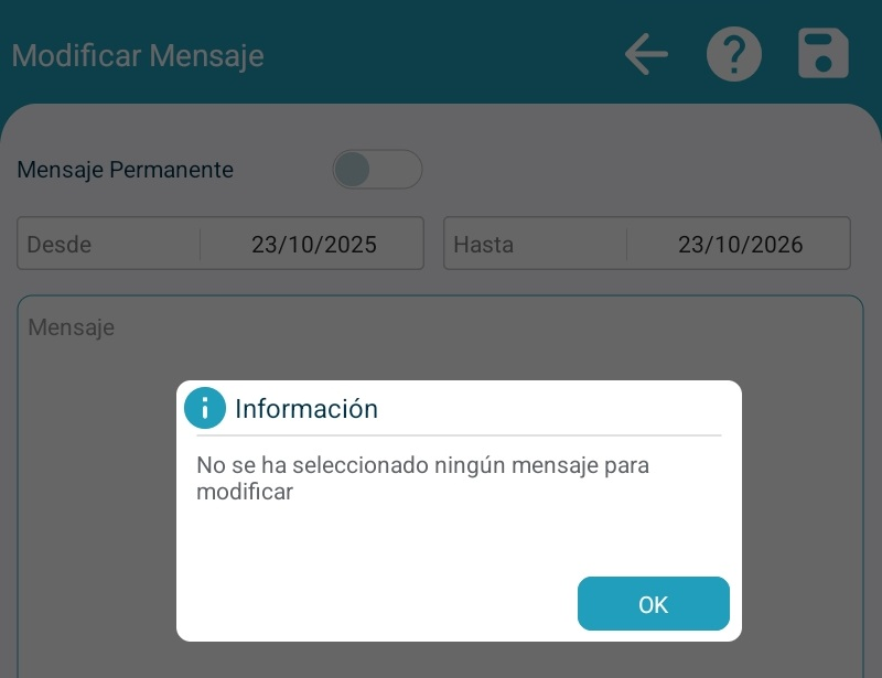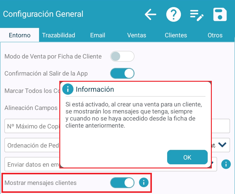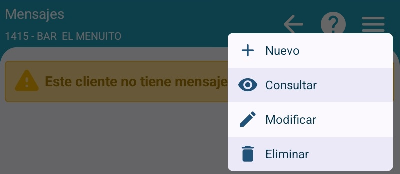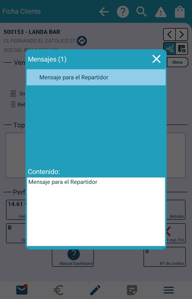 En la Visita al Cliente para realizar una Venta, si en la Configuración está activada la opción, se mostrará un Mensaje con los mensajes que tiene asignados el Cliente, para que el Vendedor o Repartidor lo tengan en cuenta.