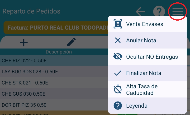 Oculta los artículos que no son de Entrega, o Muestra todos los artículos de la Nota actual de Entrega/Pedido